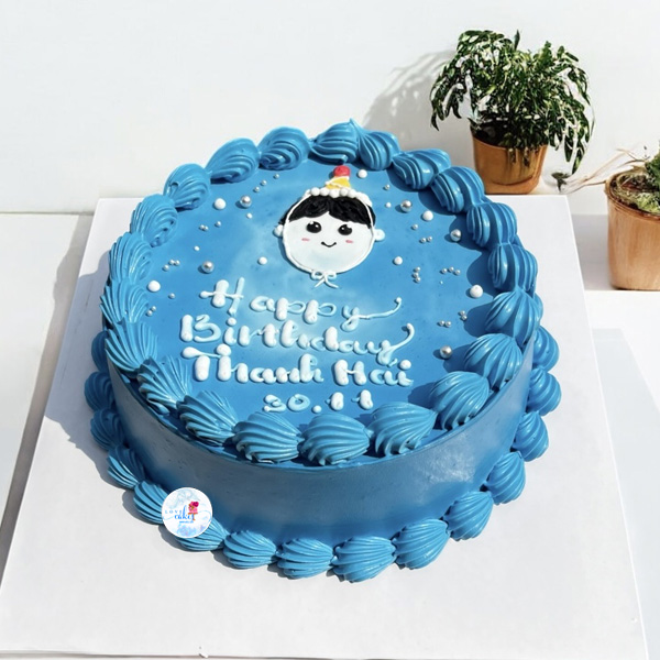 Điểm gây ấn tượng đầu tiên của chiếc bánh chính là lớp kem xanh dương mịn, tươi và đều màu. Tone xanh này mang nét đáng yêu, thân thiện, giúp chiếc bánh phù hợp với nhiều chủ đề sinh nhật khác nhau như biển, bầu trời, phi hành gia hay phong cách tối giản cho bé.