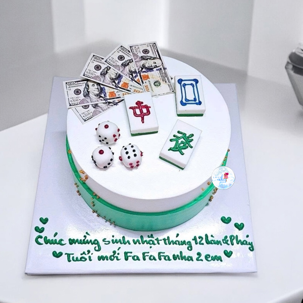 Điểm nổi bật của bánh là các quân mạt chược tạo hình nổi, kết hợp cùng xúc xắc và tiền trang trí phía trên mặt bánh. Từng chi tiết đều được làm tinh xảo, vừa đủ để nhận diện chủ đề mà không gây rối mắt.