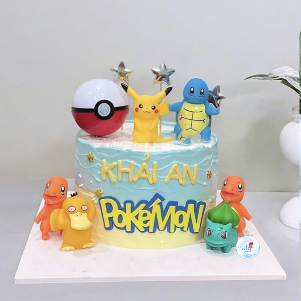 Chiếc bánh được trang trí với tông màu xanh – vàng tươi sáng, nổi bật cùng các nhân vật Pokemon quen thuộc như Pikachu, Squirtle, Charmander, Bulbasaur và Psyduck. Đây chắc chắn là điểm nhấn khiến bé trai nào cũng thích mê.